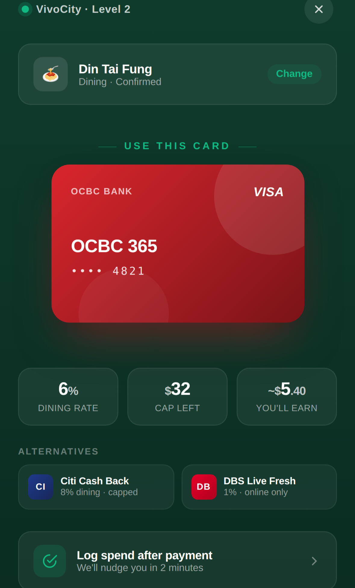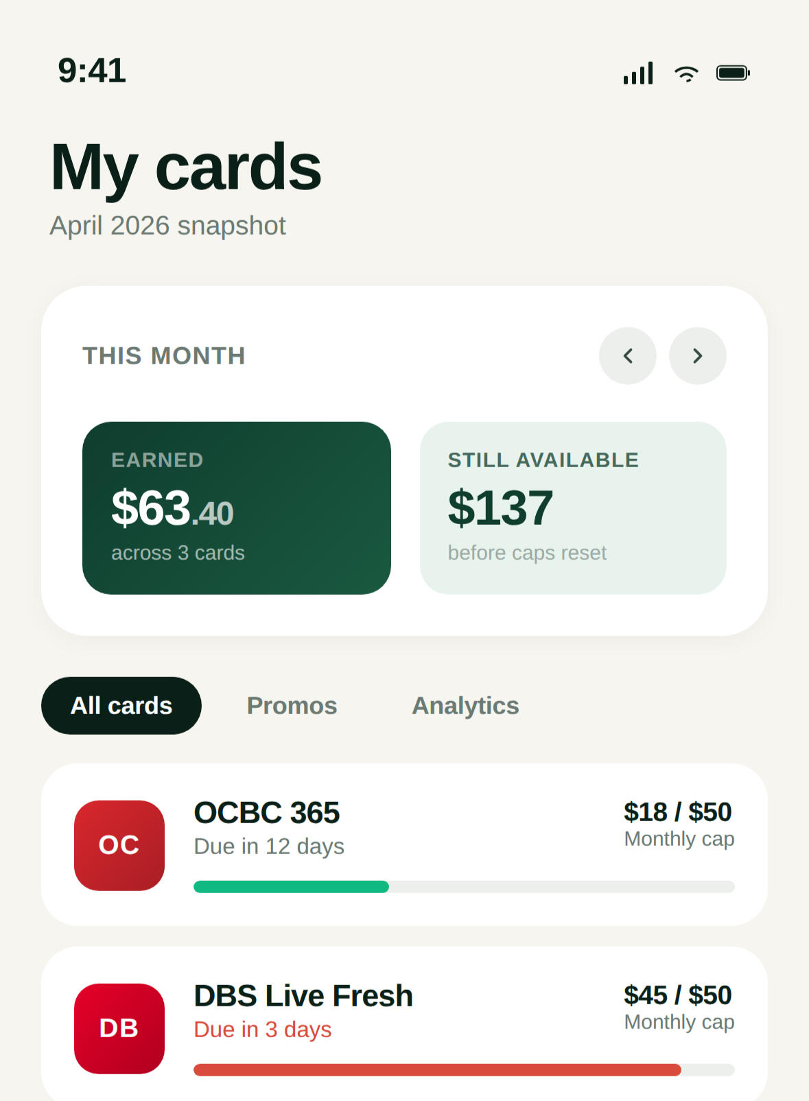 Five cards, each with different caps, rates, and reset dates. Impossible to track mentally at the checkout. You tap the capped card out of habit, miss cashback on another card, forget a promotion, or get hit with a late fee that wipes out weeks of gains.