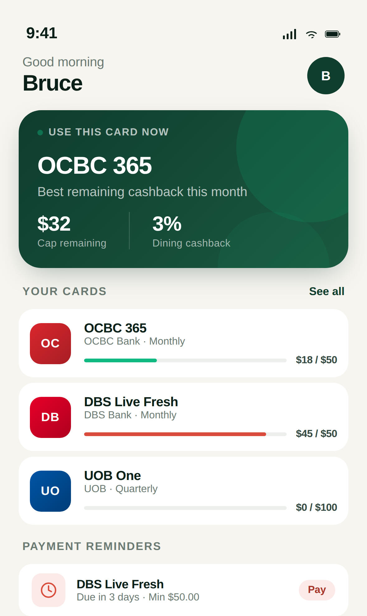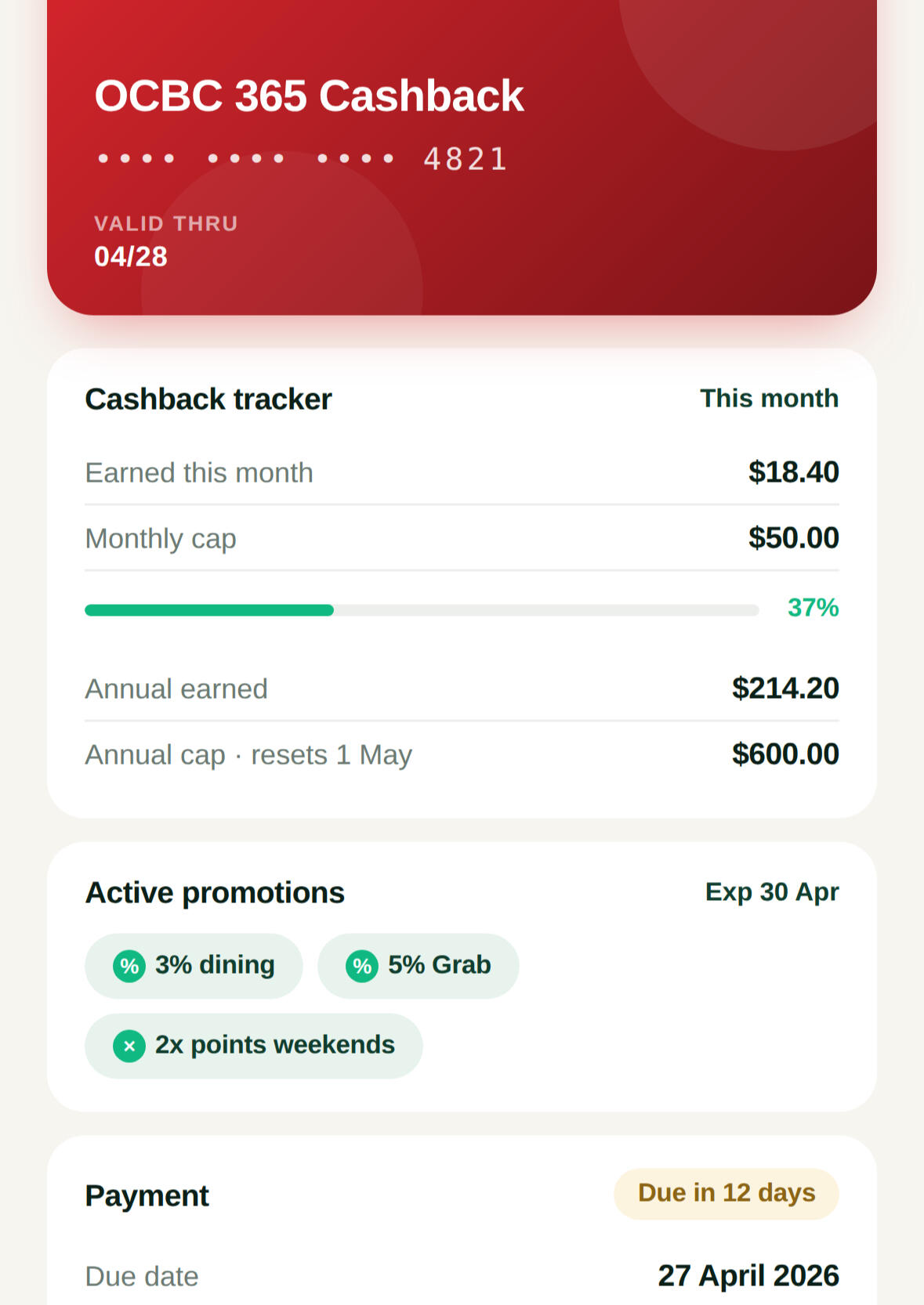 Five cards, each with different caps, rates, and reset dates. Impossible to track mentally at the checkout. You tap the capped card out of habit, miss cashback on another card, forget a promotion, or get hit with a late fee that wipes out weeks of gains.
